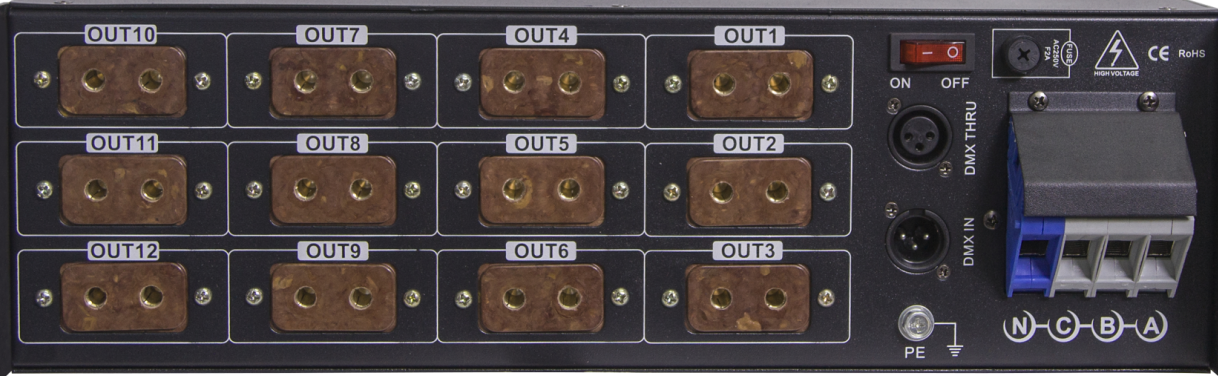 10.連接負載燈具作功率輸出,每路輸出座可接2個10A(2000W)負載燈具,帶24個10A插頭